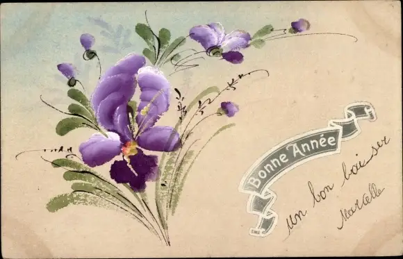 Handgemalt Litho Glückwunsch Neujahr, Blumen
