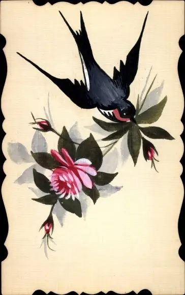 Handgemalt Litho Schwalbe mit Blumen im Schnabel