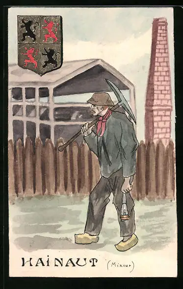 Handzeichnung Hainaut, Mineur, Minenarbeiter mit Spitzhacke, Wappen
