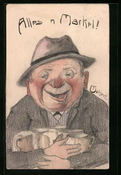 Handzeichnung Sabbernder Trinklustiger mit Bierkrügen