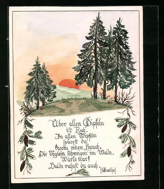 Handzeichnung Sonnenaufgang im Nadelwald mit Zitat von Goethe