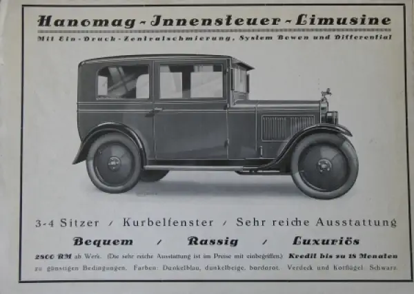 Hanomag Innensteuer-Limusine Modellprogramm 1926 Automobilprospekt (3213)