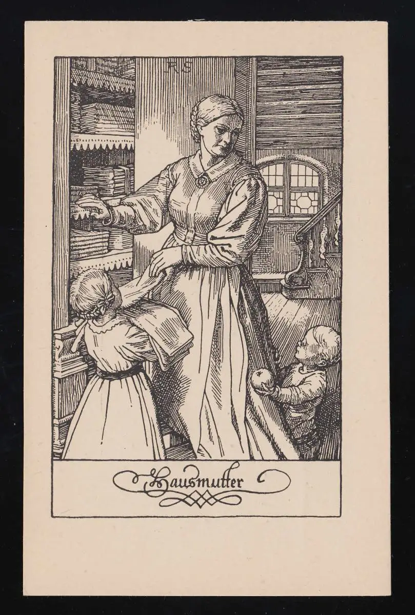 Hausmutter, Lithographie Frau die Wäsche ordnet, Rudolf Schäfer, ungebraucht