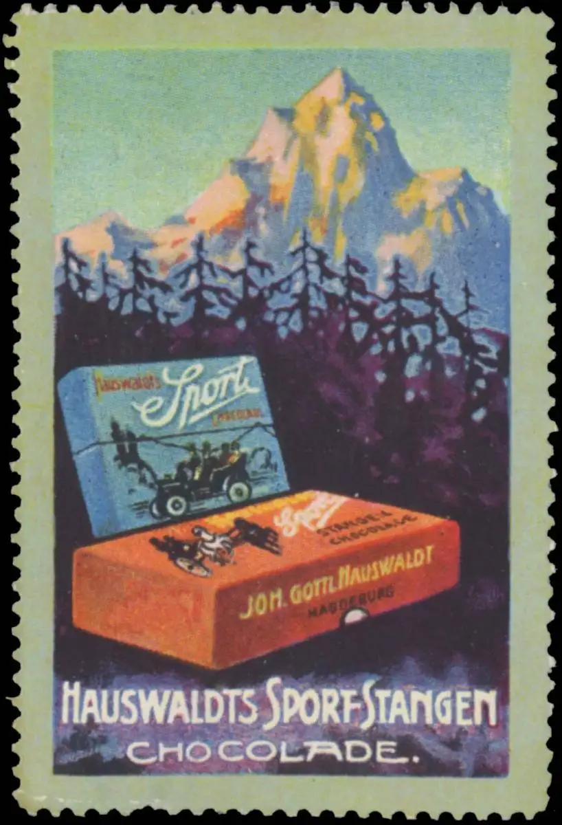 Stangen Schokolade, Berge, Automobil, Größe/Zustand: 6x4 , leicht beschädigt, Original alte Reklamemarke die seinerzeit für die Werbung benutzt wurde