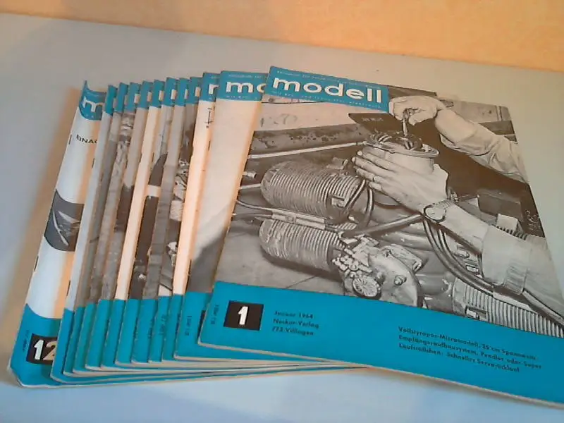 alle 12 Hefte sind altersbedingt in einem gutem, gebrauchten Zustand, »modell« ist die deutschsprachige Monatsschrift für Funksteuerung, den Fortschritt im Modellbau und der Elektronik im Selbstbau. Unter anderem aus den Inhalten: Vollstyro R/C Micromodell, 25 cm Spannweite - Laufställchen: Schneller Servorücklauf - Empfängeraufbausystem, Pendler oder Super - Der Metz-Super - 24 Fuktionen im Schnellboot - Akku-Ladegerät - Profile, mal anders betrachtet - R/C-Schwimmauto mit Bauplan - Sender-Antennen, massung und Oberwellen -Die Nadilaufmaschine - R/C-Wasserzwerge - Dezi-Sender - Elektronischer 2-Kanla-Propgeber - Graupner-Grundig-Superhet - Bauplan R/ C-Zollmotorboot - Fotoelektrischer Drehzahlmesser - Bayr. Meisterschaften Thannhausen - Einkanal-proportional für Plastikmodelle - Foto -elektronisdie Schaltungen - Strahltriebwerk für Flugmodelle - Abhörempfänger Mittelwelle / Kurzwelle - Funktionserweiterung GRUNDIG 8-Kanal - Wasserflug-Mövenpokal 1964 - „Cherie", Erfahrungen und Tips - Eisbrecher 1:100 - Deutsche R/C-Meisterschaften - Mehrkanal-Polizeiboot "Blitz" - Kontroll-Sender für das Fernsteuerlabor - 14-Kanal-Simulator-Roboter - Universalempfänger mit Steckeinheiten - Elektrischer Anlasser für Flugmodelle - R/ C-Segler K 10 - Silizium-Sender mit Multiplex-Modulation - Labor--Sinusgenerator 300 Hz bis 16 kHz - "Falcon 56", dressierter Mehrkanaler - Meßpraxis: Tongenerator und Röhrenvoltmeter Beschreibung vom Antiquariat Ardelt 3a6a Antiquariat Ardelt