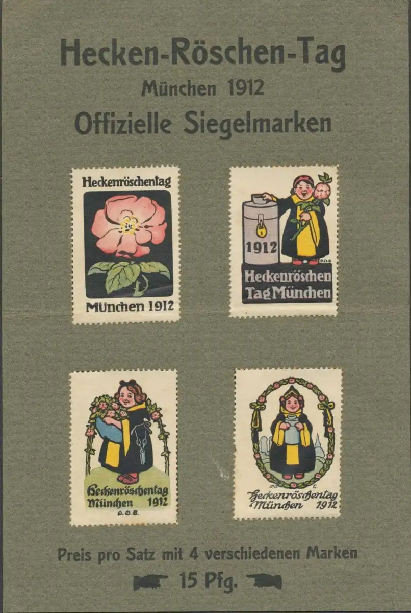 Werbeblatt aus Karton mit 4 Reklamemarken Heckenröschentag, Größe/Zustand: , guter Zustand, Original alte Reklamemarke die seinerzeit für die Werbung benutzt wurde