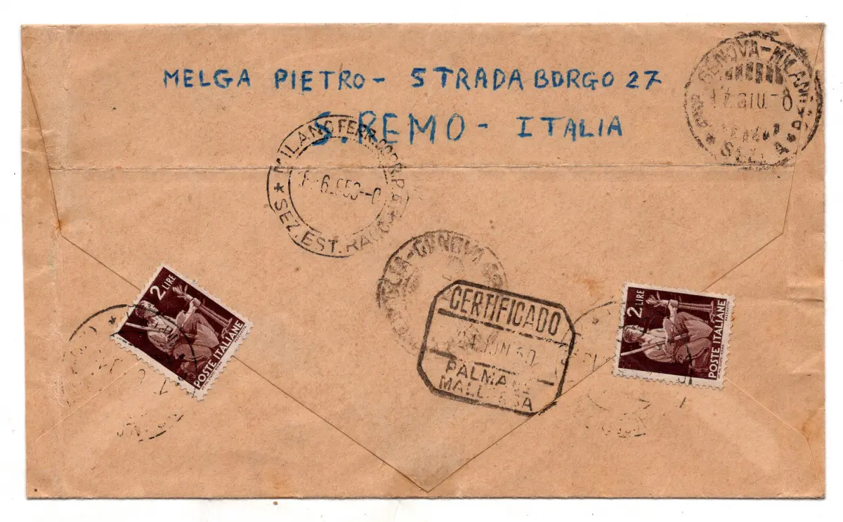 Heiliges Jahr Serie auf Umschlag - Heiliges Jahr Nr. 620/621 die Serie mit Ergänzungen Nr. 552 x 2 + 556 + 559 + 617 auf Umschlag Anschlus. für Spanien am 17.6.50 - Porto auch auf der Rückseite - im Tarif Cod. 268/13