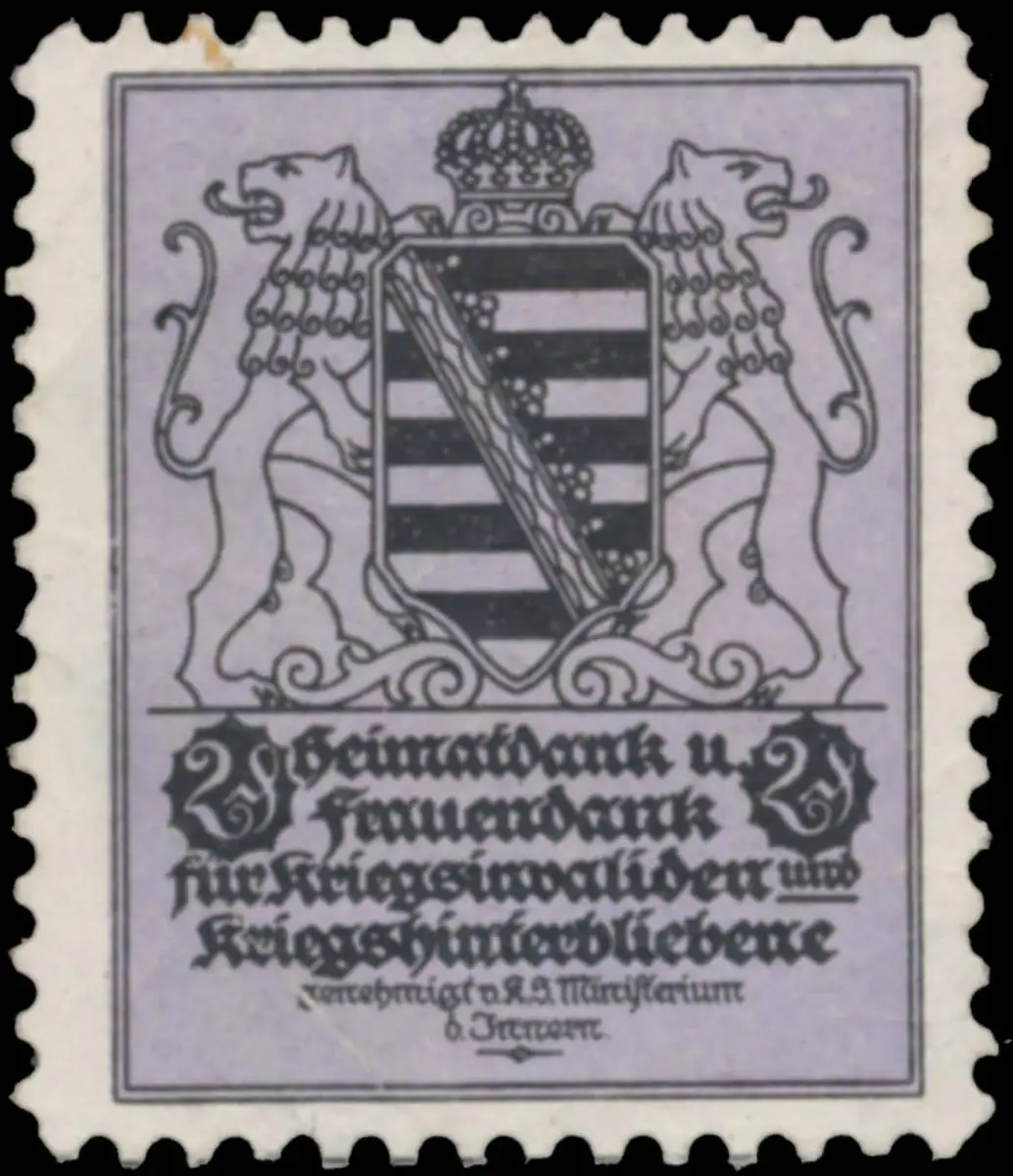 Für Kriegsinvaliden und Kriegshinterbliebene, genehmigt vom K.S. Ministerium des Innern, Spendenmarke, Sachsen, Größe/Zustand: 3x3 , guter Zustand, Original alte Reklamemarke die seinerzeit für die Werbung benutzt wurde