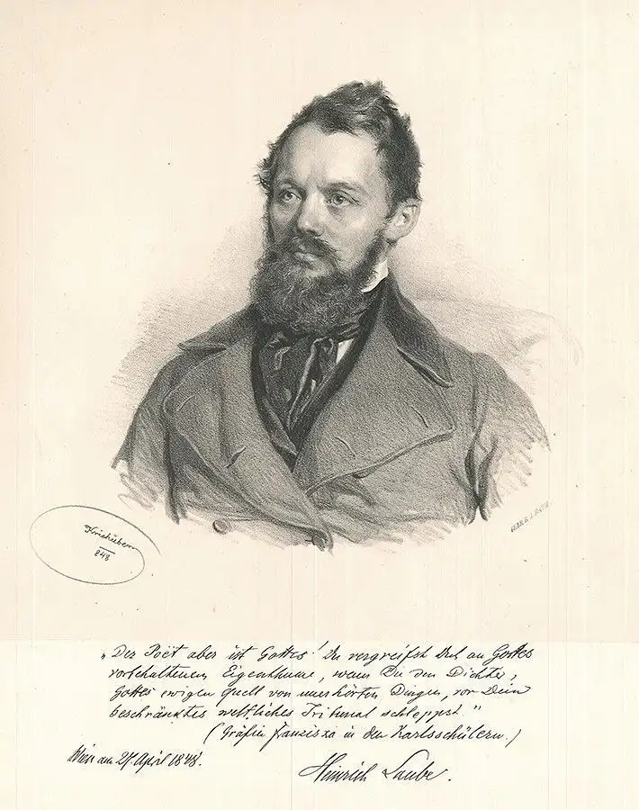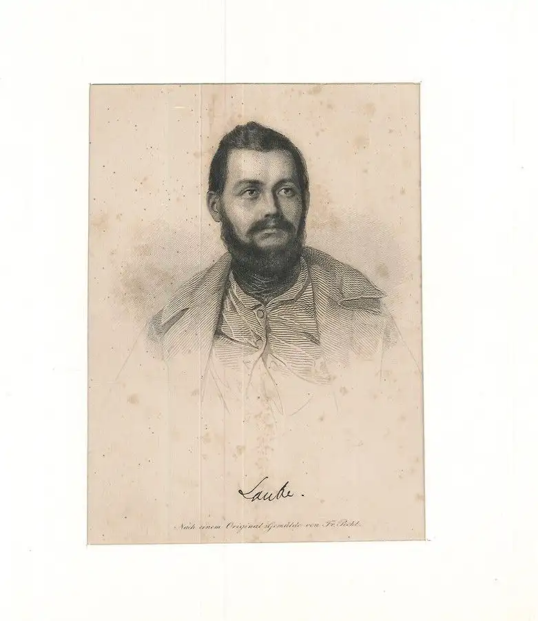 Bemerkungen: Lithographisches Portrait des Schriftstellers, Theaterdirektors und Mitgliedes der Frankfurter Nationalversammlung Heinrich Laube (1806-1884) von Joseph Kriehuber (1800-1876). Laube, der zunächst Theologie und später Literatur studiert hatte, nahm aktiv am politischen Geschehen seiner Zeit teil, 1848 hatte er ein Mandat in der Frankfurter Paulskirche. Von 1849 - 1867 war er Direktor des Wiener Burgtheaters. Im Stein signiert und datiert. Unter der Darstellung mit faksimiliertem Vierzeiler aus Laubes "Die Karlsschüler". DABEI: (nach) PECHT, Friedrich. Laube. Stahlstich. "Nach einem Original-Gemälde von Fr. Pecht". [Stuttgart, 1892] 17, 2 x 19, 6 cm (Blattgr.). Etwas stockfleckig.