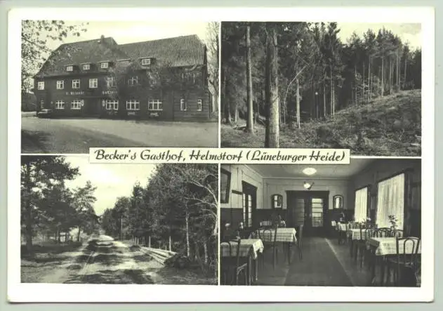 Helmstorf um 1950 (intern : 1019109) Artikelbeschreibung u. Zustand : Siehe Scan. Weitere Infos : Alte Ansichtskarte "Becker's Gasthof, Helmstorf (Lueneburger Heide)". PLZ-Bereich pauschal 21218. Rueckseite kleiner Werbetext des Gasthauses neben dem Anschriftenfeld. Postalisch nicht gelaufen