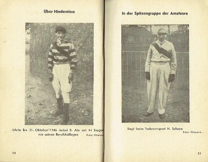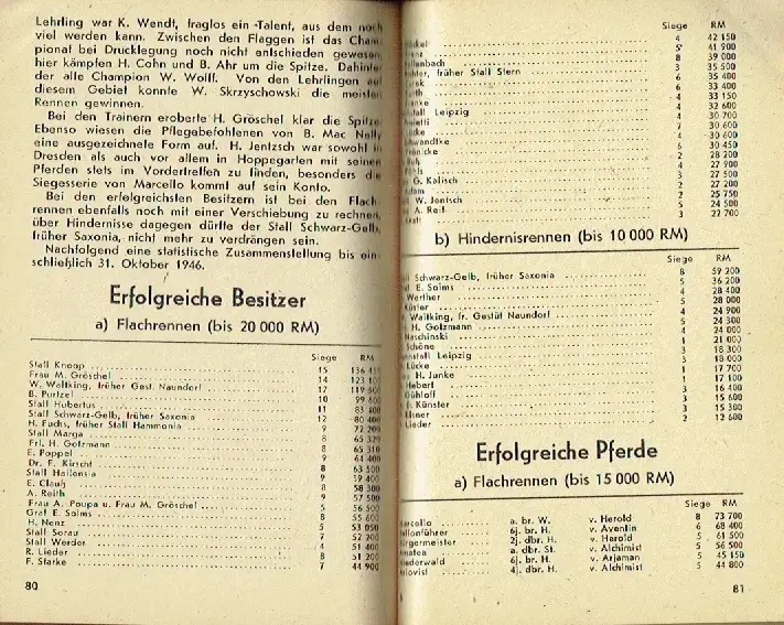 guter Zustand, Gebrauchs- und Alterungsspuren: Umschlag etwas abgenutzt und verschmutzt - Rücken oben und unten je c. 1 cm aufgerissen - Rückseite mit Dreiangel im oberen Rand - Papier teils etwas vergilbt, aber Seiten überwiegend sauber und ordentlich, zahlreiche Seiten mit privaten Notizen mit Tinte und Bleistift - Umschlag und Seiten teils etwas eselsohrig, herausgegeben mit Genehmigung der Sowjetischen Militär-Verwaltung (Ostberlin / SBZ) - einige Fotos von Pferden und Jockeys - Reklame (sogar für und von Buchmachern) - Kalendarium und Kalender - Karte der Besatzungszonen und Postleitgebiete - Postgebühren - 1946 im Sattel (Rennen des vergangenen Jahres und deren Statistiken) - Seiten für Adressen, kartoniert, ca. 10,5 x 14,5, 144 Seiten mit einigen Bildern