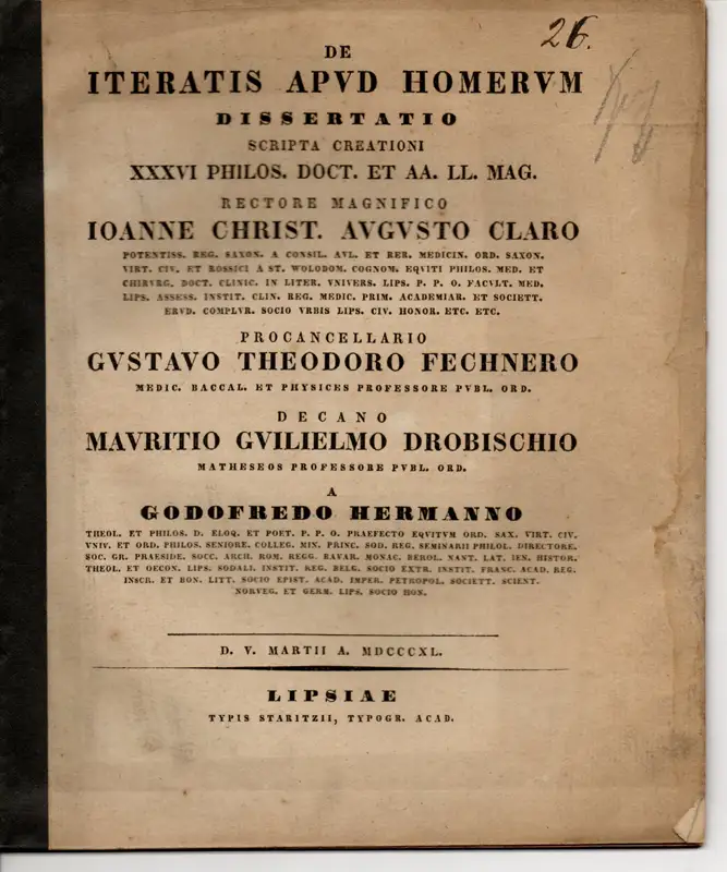 30 S., 21 cm, Promotionsankündigung von: Julius Robert Dihm, Edmund Friedrich Ulrich Happel, Hermnann Leopod Zunck, Anton Stehr, Karl Gustav Heiland, Theodor Doehner, Eduard Kerst, Wilhelm Ferdinand Lundehn, Johann Friedrich Ludwig Theodor Merzdorf, Johann Karl Christoph Knoblauch, Eugen Bernhard Ludwig Borkenhagen, Johann Gottfried Wetzstein, Otto Rudolph Abendroth, Christian Friedrich Holl, Geirg Martin Thomas, Emil Preusser, Albert Heinrich Theodor Thym, Alexander Becker, Maximilian Hermann Frotscher, Karl Ludwig August Hübner, Friedrich Franz Heinrich Marckwart, Karl Gustav Meissner, Friedrich Wilhelm Franz Gutsmuths, Christian Albert Weinlig, Ernst Gustav Naumann, Franz Theodor Heyland, Dagobert, Ernst Friedrich Boeckel, Oskar Karl Alfred Hunger, Augustus Friedrich Müller, Friedrich Hermann Hoering, Benjamin Traugott Schoenrich, Samuel Gottlob Robert Philipp, Gustav Adolph Flemming, Franz Robert Polster, Johann Siebelis, Georg Bippart jeweils mit kurzem Lebenslauf, Staubrand, Deckblatt mit handschr. Markierungen, Rand wasserfleckig, papierbedingt gebräunt. Hermann (aus Leipzig, 1772-1848).