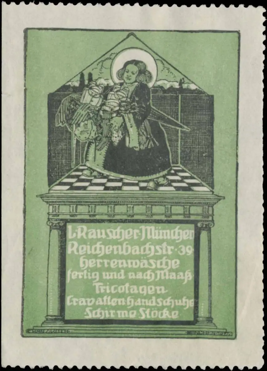 Wäsche, Schirme, Stöcke, Krawatten, Handschuhe, Münchner Kindl, Größe/Zustand: 7x6 , guter Zustand, Original alte Reklamemarke die seinerzeit für die Werbung benutzt wurde