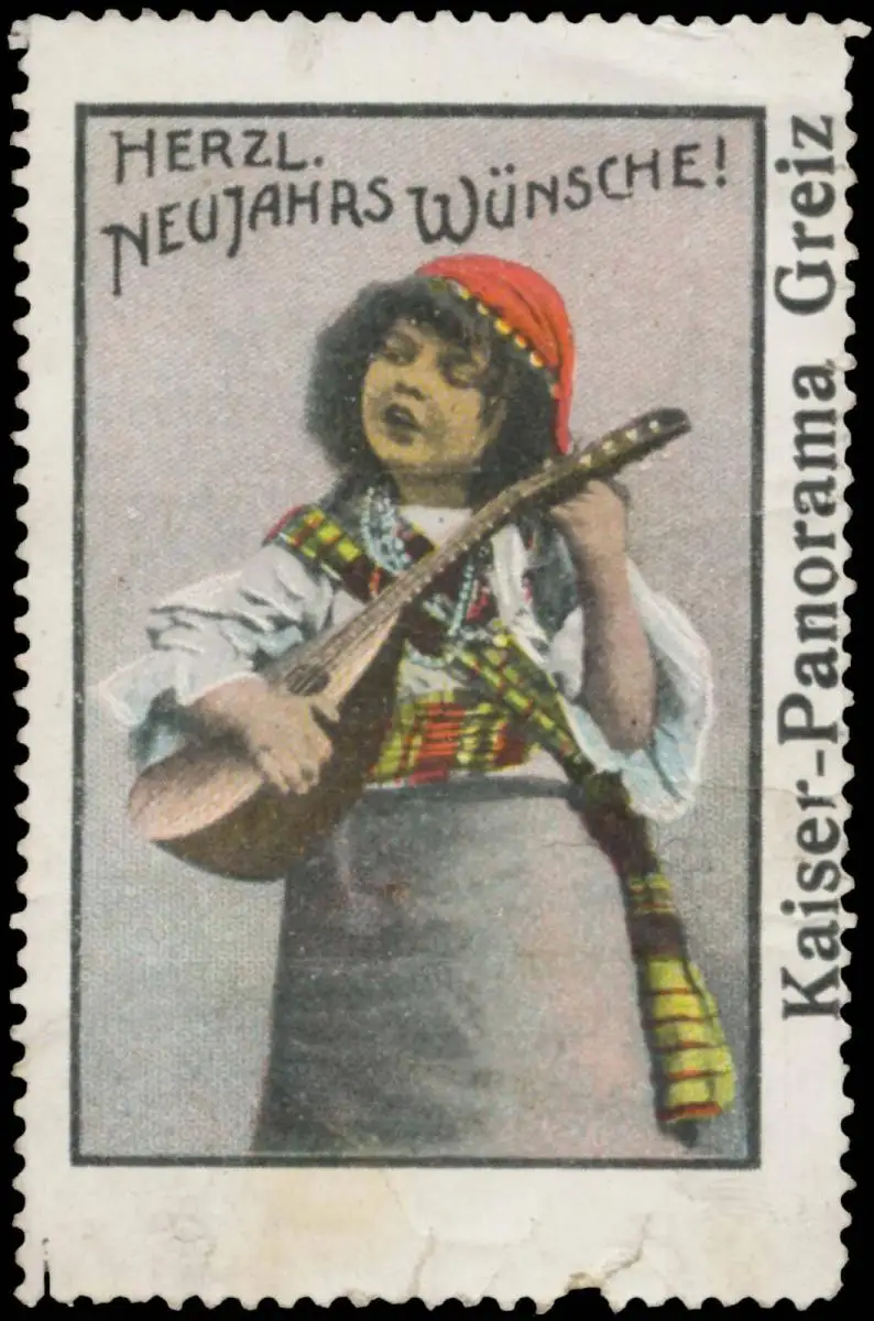 Kind mit Laute, Neujahr, Kaiserpanorama, Größe/Zustand: 6x4 , beschädigt, Original alte Reklamemarke die seinerzeit für die Werbung benutzt wurde