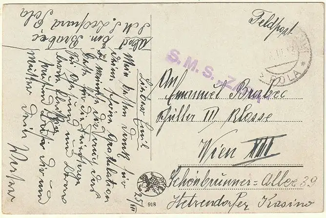 Bemerkungen: Gelaufen m. Stempel: S.M.S. Zara. Einzeiler violett - KALIS 4-P.70 neben K.u.K. MFPA / 26. III. 18 / Pola - 1879 als Torpedoschjiff, Wachschiff & Seeaspirantenkurs.