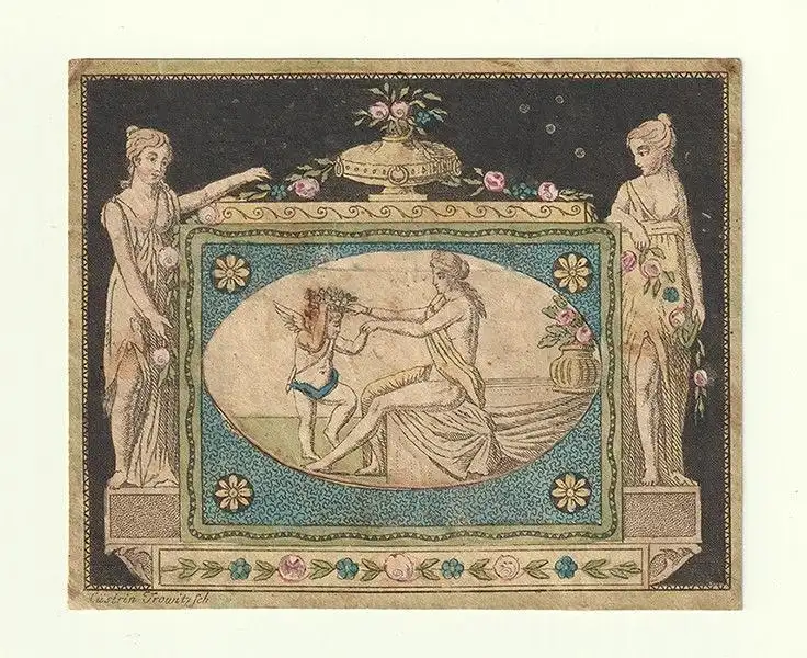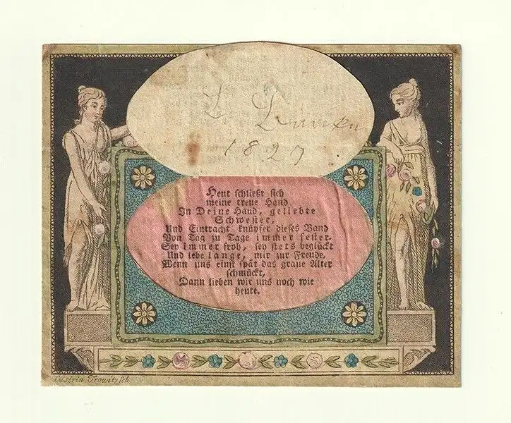 Bemerkungen: Pazaurek, Gustav E., Biedermeier-Wünsche. Stuttgart [1908]. S. 4 - Preußisches Biedermeier-Klappbillet aus dem bekannten Verlag Trowitsch aus der Zeit des ersten Firmensitzes in Küstrin/ Kostrzyn nad Odra. Namensgebend für den Verlag war Carl Gottlob Trowitzsch (1745-1819), der eine bereits existierende Druckerei 1780 übernahm. Mit dem Umzug der neumärkischen Regierung nach Königsberg an der Neumark, verlegte auch Trowitzsch seinen Verlag dorthin. Später folgten Umzüge nach Franfurt/Oder und Berlin. Das vorliegende Billet ist signiert "Cüstrin Trowitzsch". Als klassizistisch-antikisierter Freundschaftsaltar gestaltete Karte, denn "daß die damals in allen englischen Parkanlagen unvermeidlichen Urnenaltäre und Freundschaftstempel auch auf den Wunschkarten nicht selten sind, liegt auf der Hand" (Pazaurek, S. 17). Auf der Frontseite des Altars wird in einer Mandorla eine Szene gezeigt, in der eine sitzende Göttin und ein Putto (wohl Venus und Amor?) mit einer Blütenkrone hantieren. Das Klappbillet gehört zu den gängigsten Gestaltungsformen biedermeierlicher Luxusbillets. Unter der klappbaren Mandorla verbirgt sich der typograph. Text "Heut schließt sich meine treue Hand...", der auf das zeitgenössisch hochgepriesene Freundschaftsideal verweist, das "von der Überreichung eines `Souvenirs` bis zur Versicherung sklavischer Unterwürfigkeit reicht" (Pazaurek, S. 17). Klappe verso mit Namen "L. Laake 1827". Verso mit Vermerk "Ludwig Laake 1826" und "Ludwig Laake Braunschweig 1827".