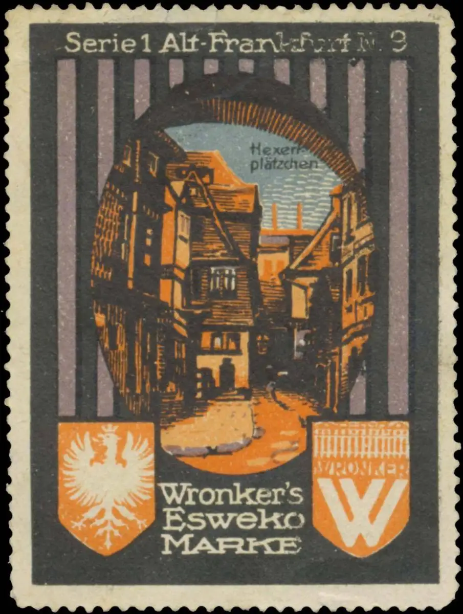 Serie Alt-Frankfurt Nr. 9, Wronkers Esweko Marke, Größe/Zustand: 6x5 , beschädigt, Original alte Reklamemarke die seinerzeit für die Werbung benutzt wurde