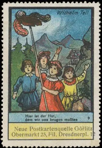 Serie: Wilhelm Tell. Neue Postkartenquelle in Görlitz, Bruno Hanzig, Ansichtskarten und Schreibwaren, Obermarkt 25, Filiale: Dresdner Platz 12, Größe/Zustand: 6x4 , guter Zustand, Original alte Reklamemarke die seinerzeit für die Werbung benutzt wurde