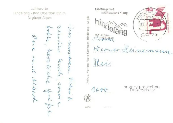 Hindelang mit Bad Oberdorf und Allgaeuer Alpen Hindelang postalisch gelaufen 1977 Erhaltung siehe scans [WerneD78] WernPID7