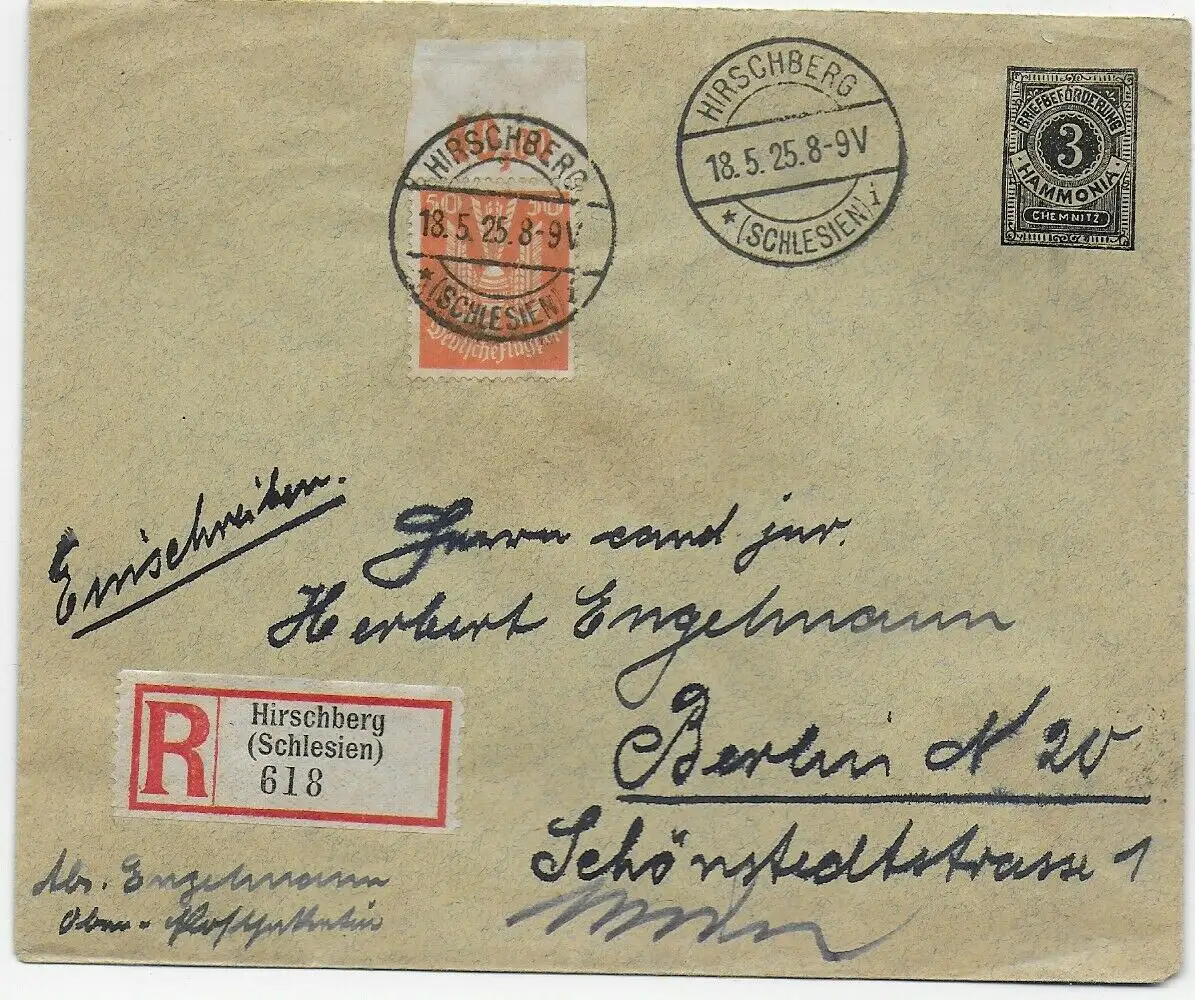 Hirschberg/Schlesien 1925 als Einschreiben nach Berlin