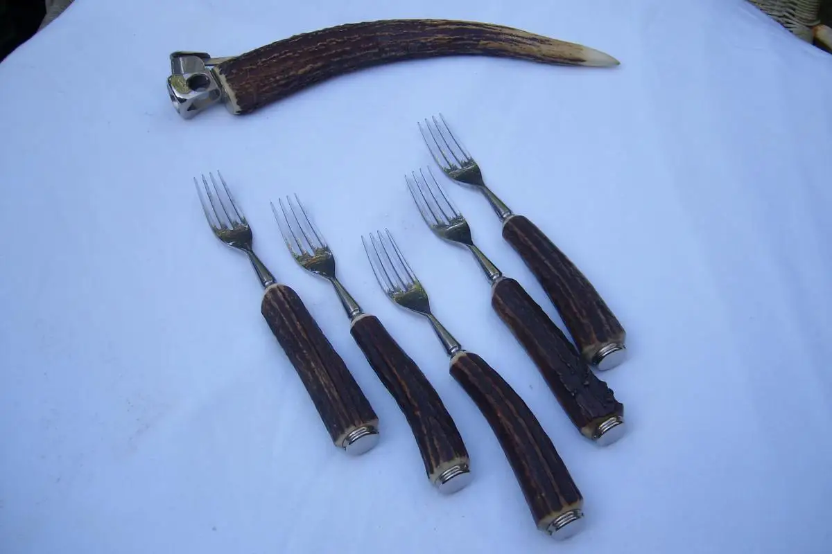 Es sind 5 Menügabeln mit Hirschhorngriff sowie 1 Zigarrenabschneider mit Geweihende