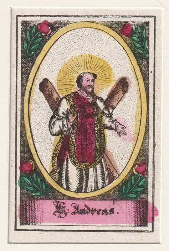 Bemerkungen: Dargestellt ist der Heilige Andreas in reichem Ornat vor dem Andreaskreuz, auf dem er das Martyrium erlitt. Sein Gedenktag ist der 30. November. Er ist u. a. Patron der Fischer und Fischhändler.