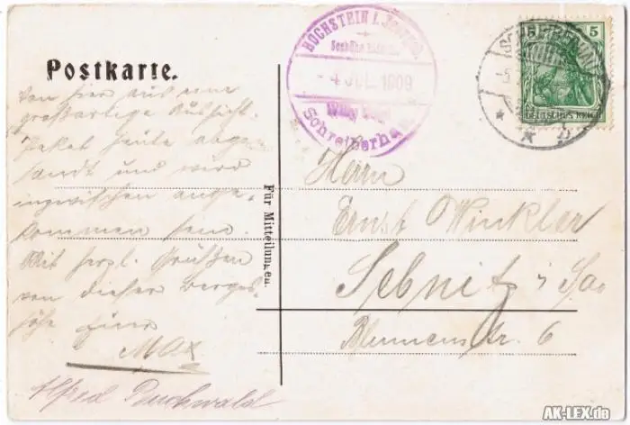 Infos: Stempel: "Hochstein im Isergebirge - Seehöhe 1068m -- 4.Juli 1909 -- Willy Voigt -- Schreiberhau"