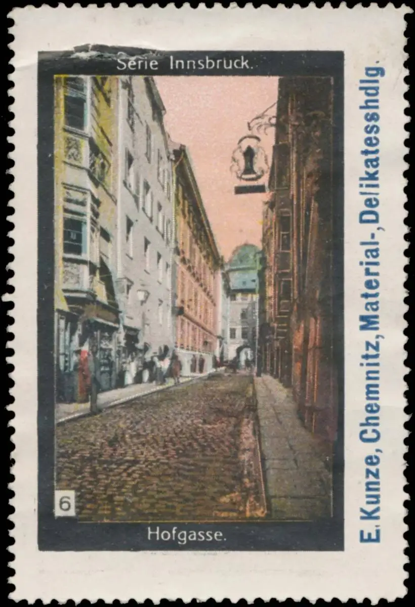 Serie Innsbruck, Material-, Delikatessenhandlung, Größe/Zustand: 7x5 , beschädigt, Original alte Reklamemarke die seinerzeit für die Werbung benutzt wurde
