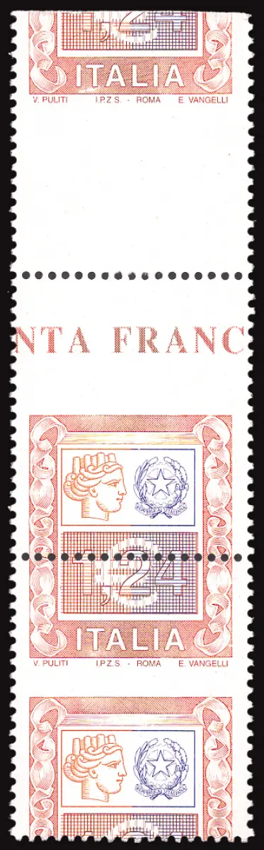 MNH - Vollgummi - Hohe Eurowerte 1,24 Nr. 2580 Paar b. von oben mit stark verschobener Verzahnung - Das erste Exemplar zeigt aufgrund der starken Verzahnungsverschiebung den Randschriftzug vollständig in der Vignette und der Wert 1,24 fehlt - seltene und ungewöhnliche so signifikante Verschiebung Cod. 925/17
