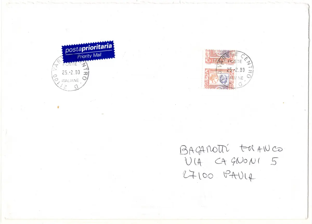 Umschlag - Hohe Werte Euro 1,24 Nr. 2580 stark vertikal verschobene Zahnung, so dass Wert und Schriftzug Italien oben statt unten stehen (Kat. Einheitliche Nr. 2621Da), auf Umschlag gereist von Varese nach Pavia am 25.2.2003 - Uncommon Cod. 926/17
