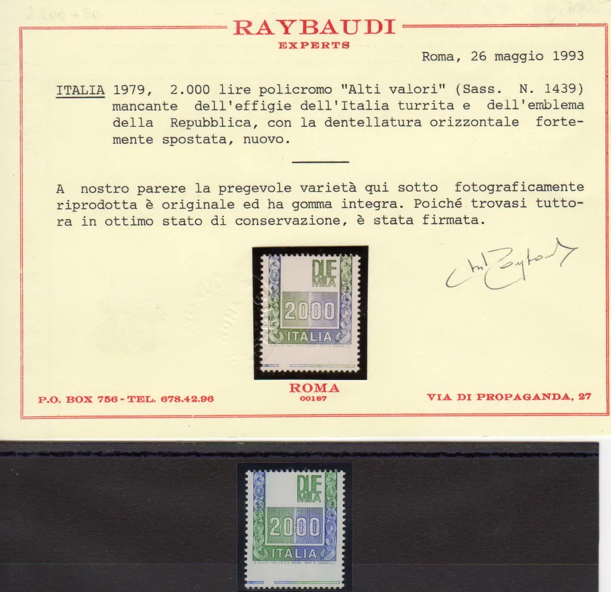 Hohe Werte Lire 2.000 Sorten Druck und Verzahnung Vollgummi MNH - Hohe Werte Lire 2.000 Nr. 1439 ohne Druck von Syrakus und dem Wappen der Republik, mit stark nach unten verschobener Verzahnung - stammt aus der letzten horizontalen Reihe des Blattes und zeigt in der Vignette die marginalen Farbstriche - Selten - Zert. Ray. Cod. 569/15