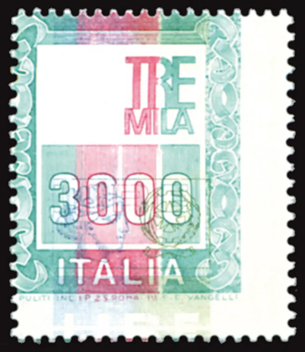 Hohe Lire-Werte 3.000 Sorten verschobene vertikale Verzahnung Vollgummi MNH - Hohe Lire-Werte 3.000 Nr. 1440 verschobene vertikale Verzahnung und Mittelfarben mit stark nach unten verschobenem Syrakuskopf pro mm. 12 Italien sinkt - auffällige Cod. 532/16
