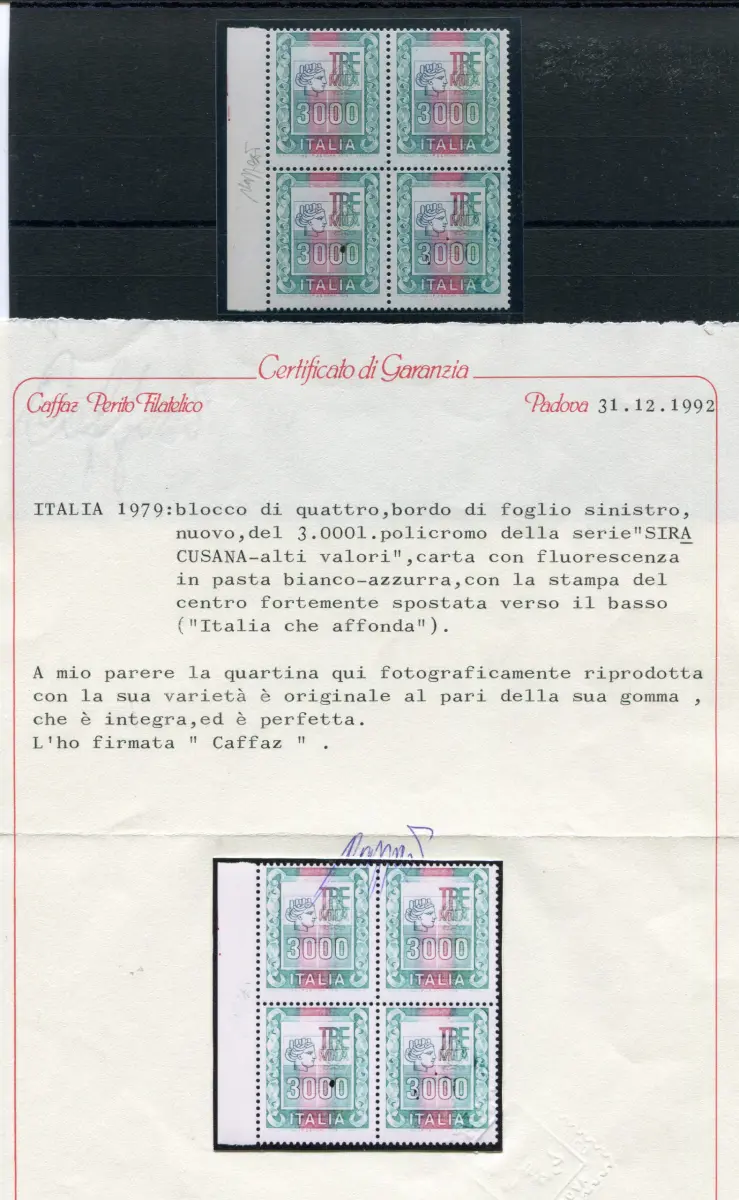 Hohe Werte Lire 3.000 Viertel Sorte verschobenes Zentrum Vollgummi - MHN - - - Hohe Werte Lire 3.000 Nr. 1440 Quartina b. di f. (Fluoreszenz in weiß-blauer Paste) mit stark verschobenem Mitteldruck nach sinkendem Unteritalien (Sass. spec. Nr. 1054 Aa) - Cert. Caffaz - Kat. 500 Cod. 691/14
