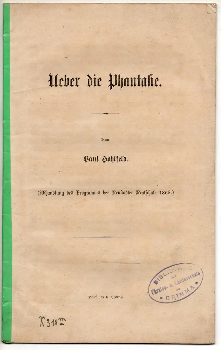 Hohlfeld, Paul: Ueber die Phantasie. Programm der Realschule zu Neustadt-Dresden 1868.