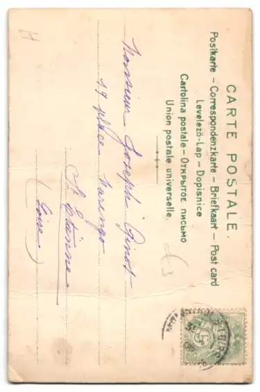 Personenbezogene Daten auf der Rückseite der Karte wurden durch blauen Textmarker unkenntlich gemacht. Die blauen Stellen sind auf die Vorderseite durchgeweicht und wirken sich negativ auf das Postkartenfoto aus