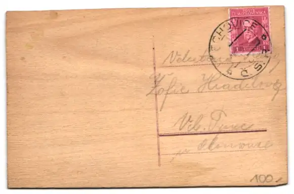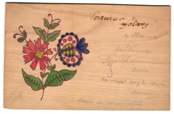 Personenbezogene Daten auf der Rückseite der Karte wurden durch blauen Textmarker unkenntlich gemacht. Die blauen Stellen sind auf die Vorderseite durchgeweicht und wirken sich negativ auf das Postkartenfoto aus