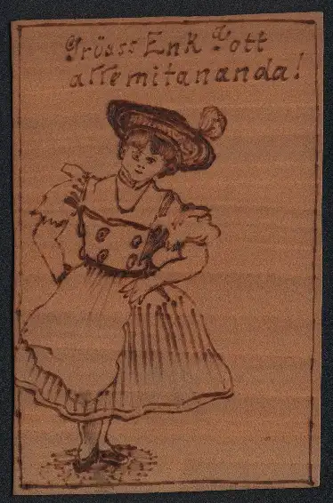 Holz-AK Eine Dame in Tracht mit einem Federhut