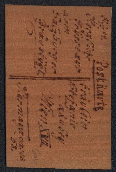 Personenbezogene Daten auf der Rückseite der Karte wurden durch blauen Textmarker unkenntlich gemacht. Die blauen Stellen sind auf die Vorderseite durchgeweicht und wirken sich negativ auf das Postkartenfoto aus