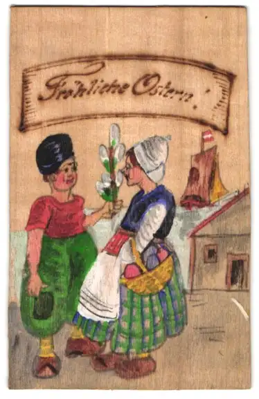 Holz-AK Mann und Frau in Tracht, Segelboot