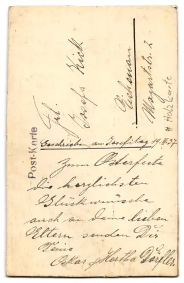Personenbezogene Daten auf der Rückseite der Karte wurden durch blauen Textmarker unkenntlich gemacht. Die blauen Stellen sind auf die Vorderseite durchgeweicht und wirken sich negativ auf das Postkartenfoto aus