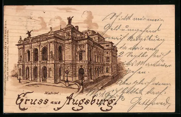 Holzbrand-Imitations-AK Augsburg, Stadt-Theater