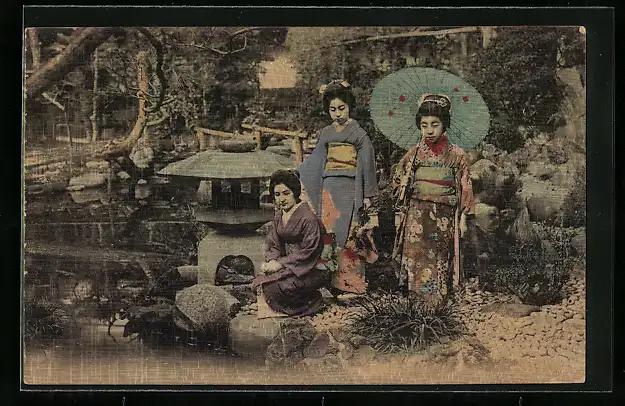 Holzbrand-Imitations-AK Drei Geishas an einem Teich
