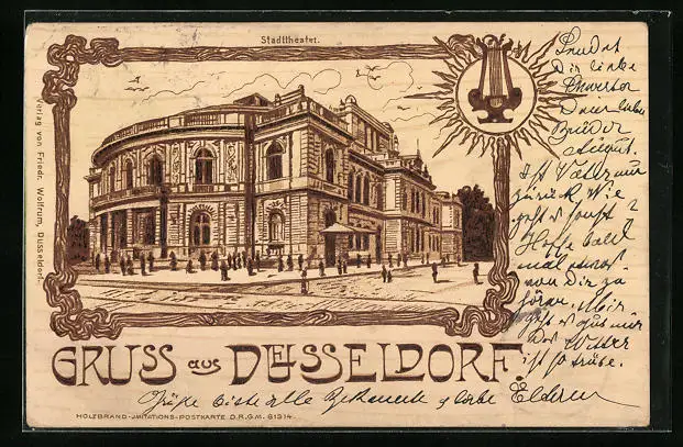 Holzbrand-Imitations-AK Düsseldorf, Stadttheater