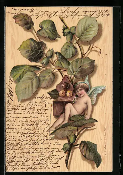 Holzbrand-Imitations-AK Englein sitzt auf einem Zweig
