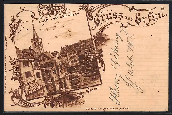 Holzbrand-Imitations-AK Erfurt, Blick vom Dämmchen