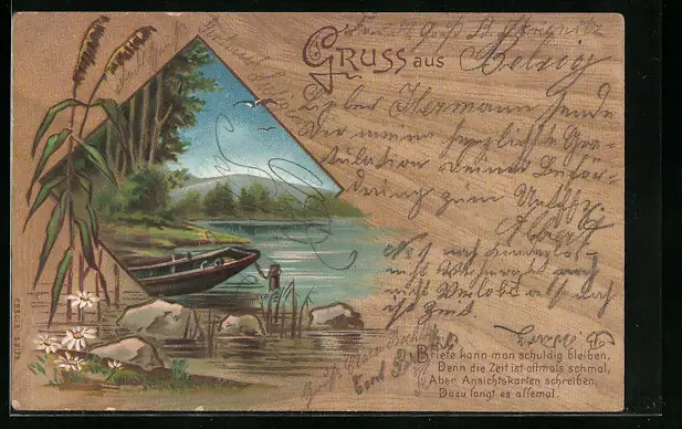 Holzbrand-Imitations-AK Idylle mir Ruderboot am Seeufer