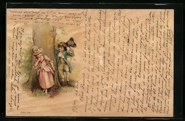 Holzbrand-Imitations-AK Kinderpaar spielt an einem Baum
