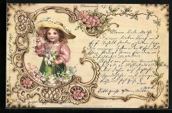 Holzbrand-Imitations-AK Kleines Mädchen mit Gänseblumen