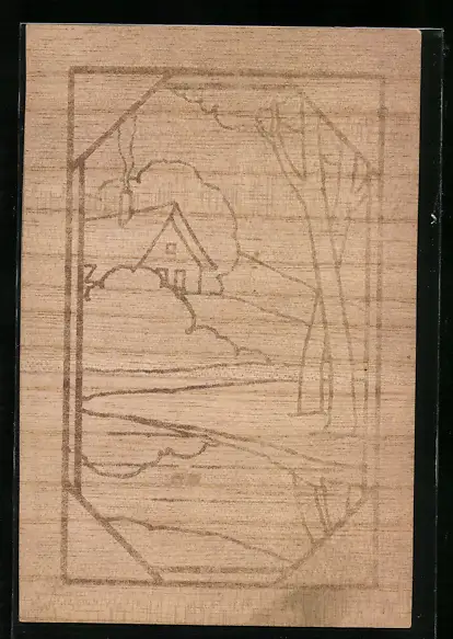 Holzbrand-Imitations-AK Landschaft mit einsamer Hütte