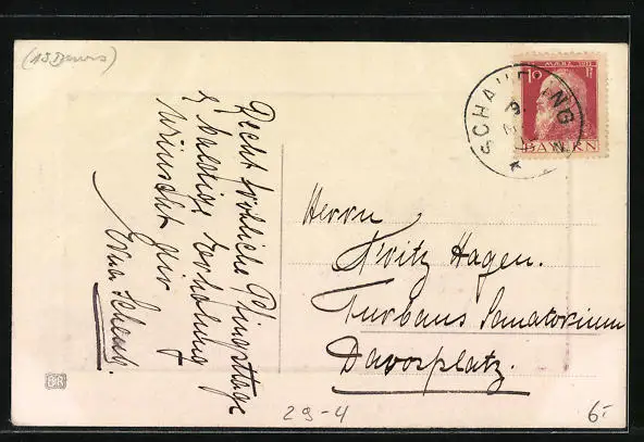 Personenbezogene Daten auf der Rückseite der Karte wurden durch blauen Textmarker unkenntlich gemacht. Die blauen Stellen sind auf die Vorderseite durchgeweicht und wirken sich negativ auf das Postkartenfoto aus